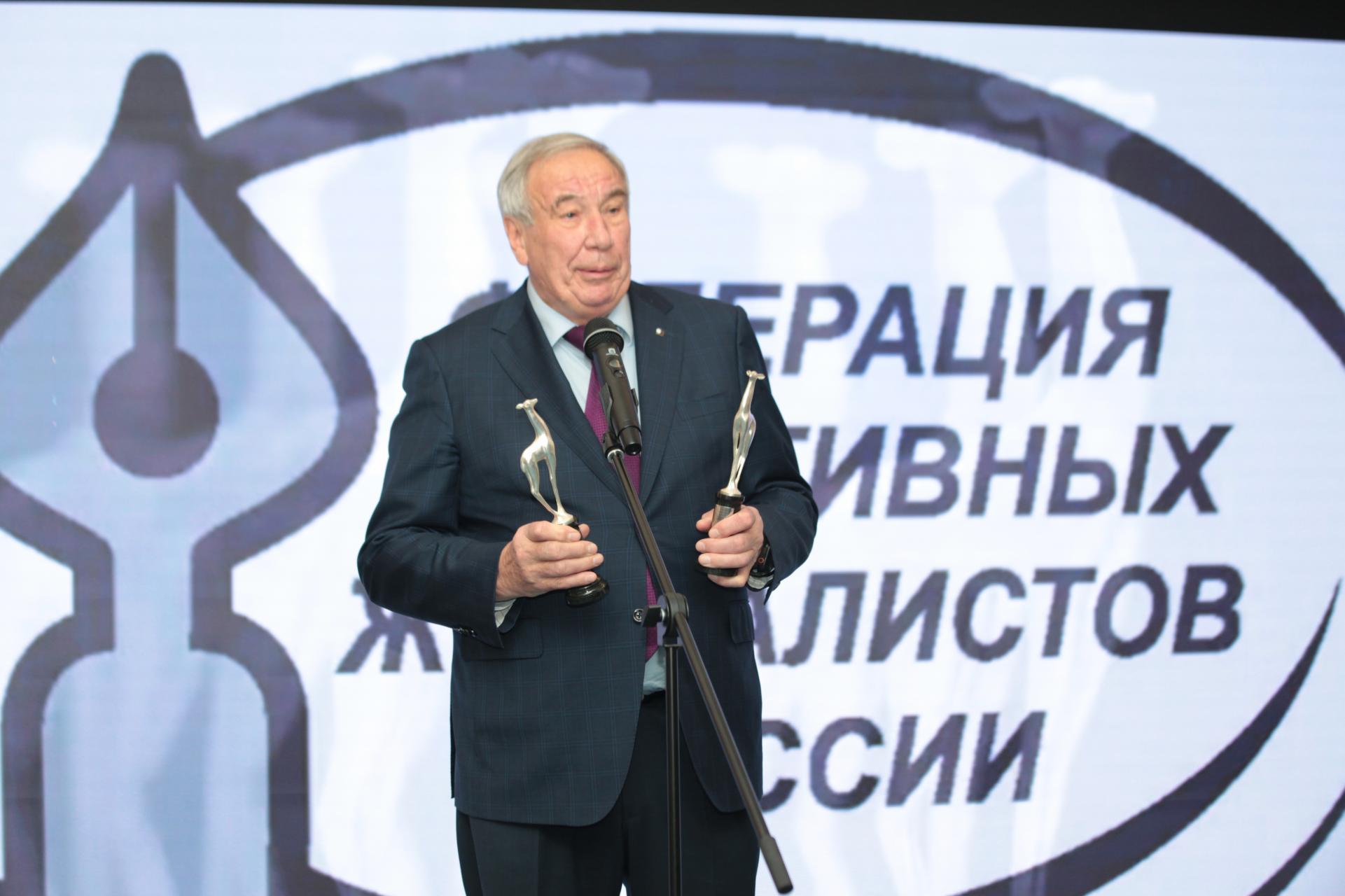 По традиции церемонию вел Виктор Гусев. Совсем недавно ему исполнилось семьдесят лет. Началась церемония с того, что почетный президент ФСЖР Николай Долгополов на правах заместителя главного редактора «РГ» и хозяина площадки поздравил нашего коллегу и вручил ему памятный знак Союза журналистов России «Ветеран журналистики».