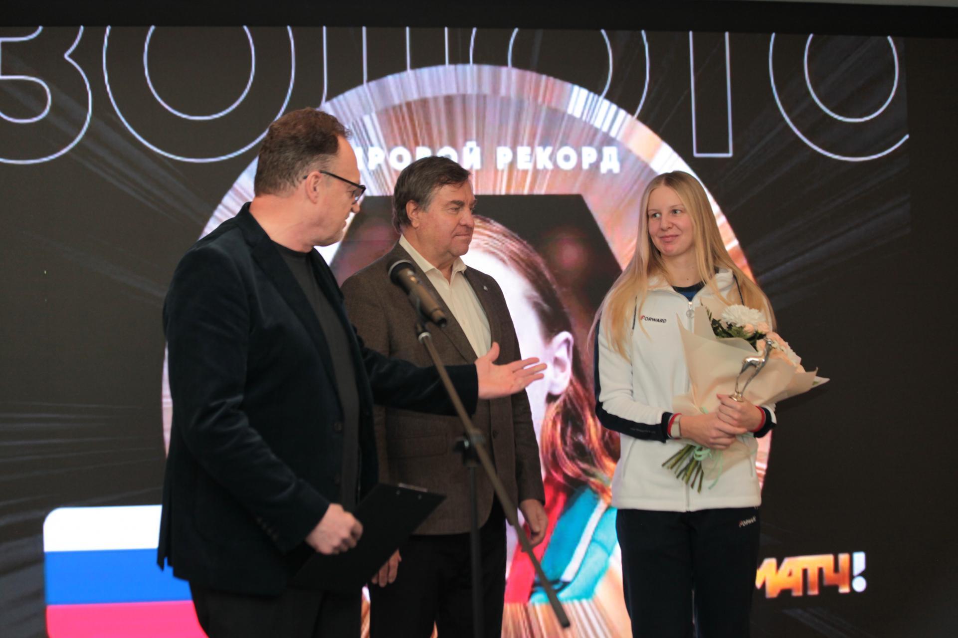 Следующим лауреатом, приглашенным на подиум, стала рекордсменка мира по плаванию Евгения Чикунова.